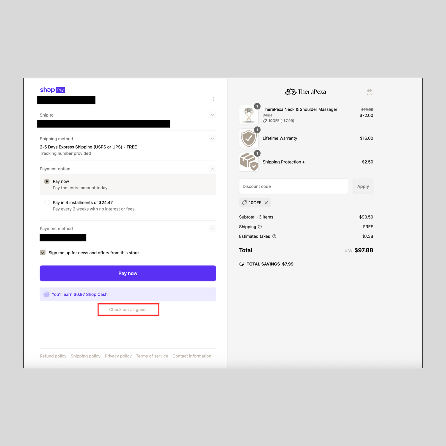 If you’re logged into your ShopPay account, make sure to select the “Check Out as a Guest” option. TrueMed payments are not processed through ShopPay, so this step is essential to use your HSA/FSA funds.