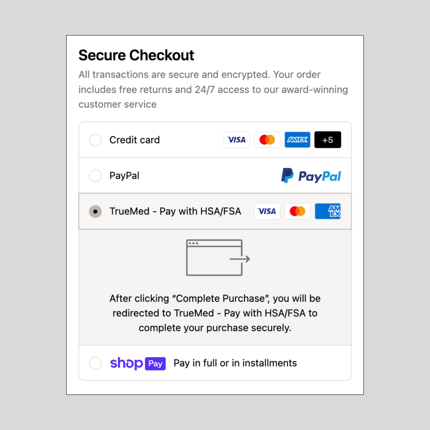 At checkout, you’ll see an option to pay with “TrueMed - Pay with HSA/FSA”. Choose this option to proceed then click on “Complete Purchase".